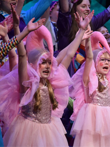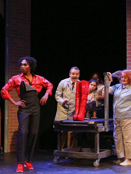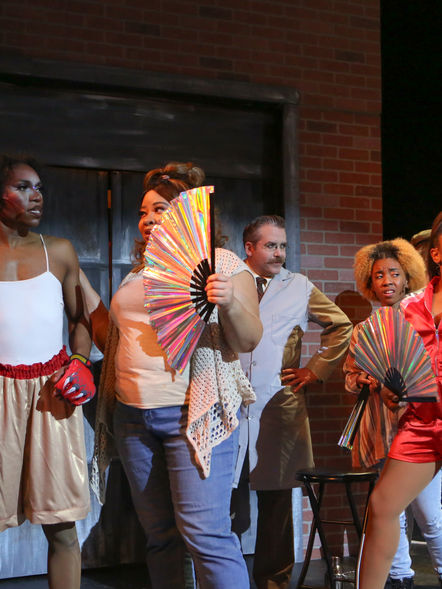Our production of Kinky Boots was all about fashion. Drag Queens are known to be their own designers and seamstresses. It seemed logical that Lola's looks would always be unique and fashion forward and different from the rest. We also wanted to make sure that Lola and her angels stood out every time they were on stage. By assigning bright colors to the Angels and dull, muted tones to everyone else, we were able to make a visual impact every time the girls made an entrance.